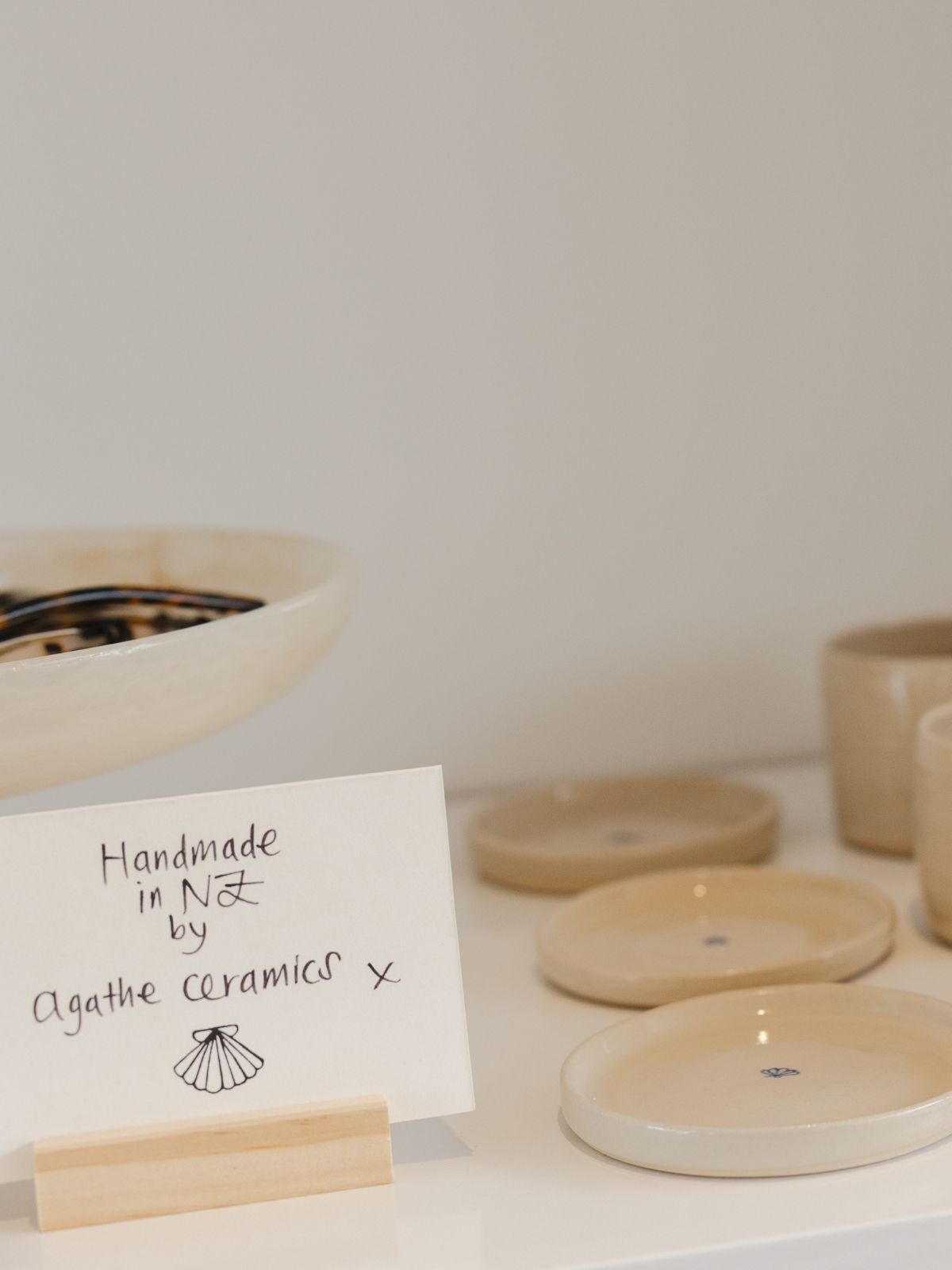 Lovingly & locally handcrafted by Ceramic Artist Agathe. Each one has been carefully adorned by hand painted shapes.