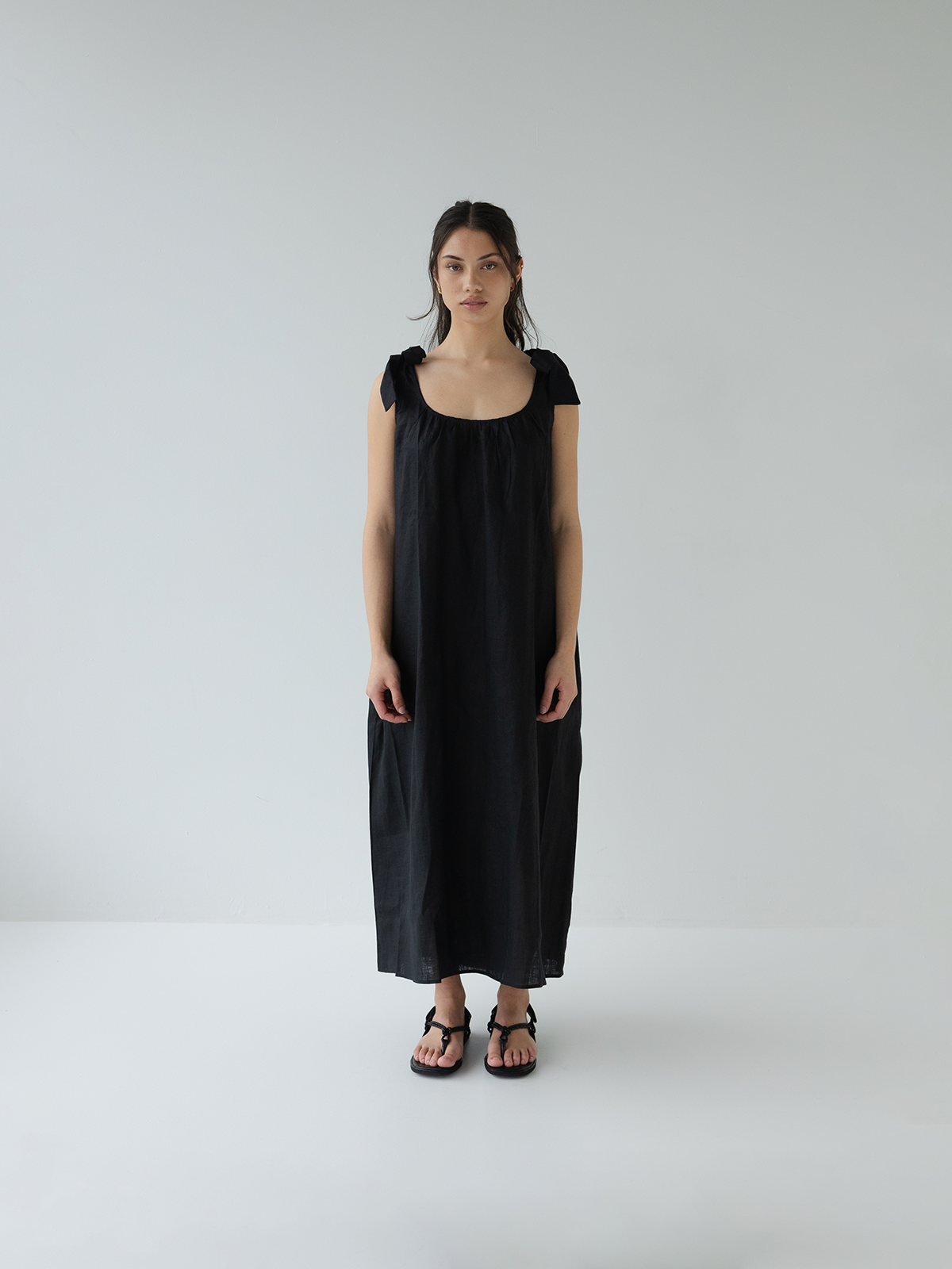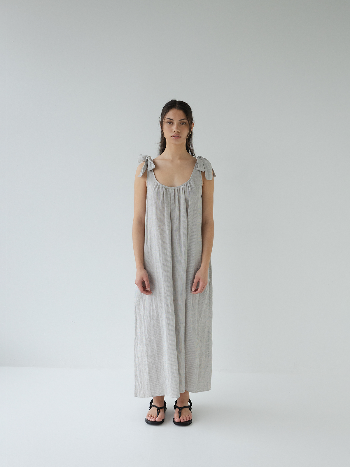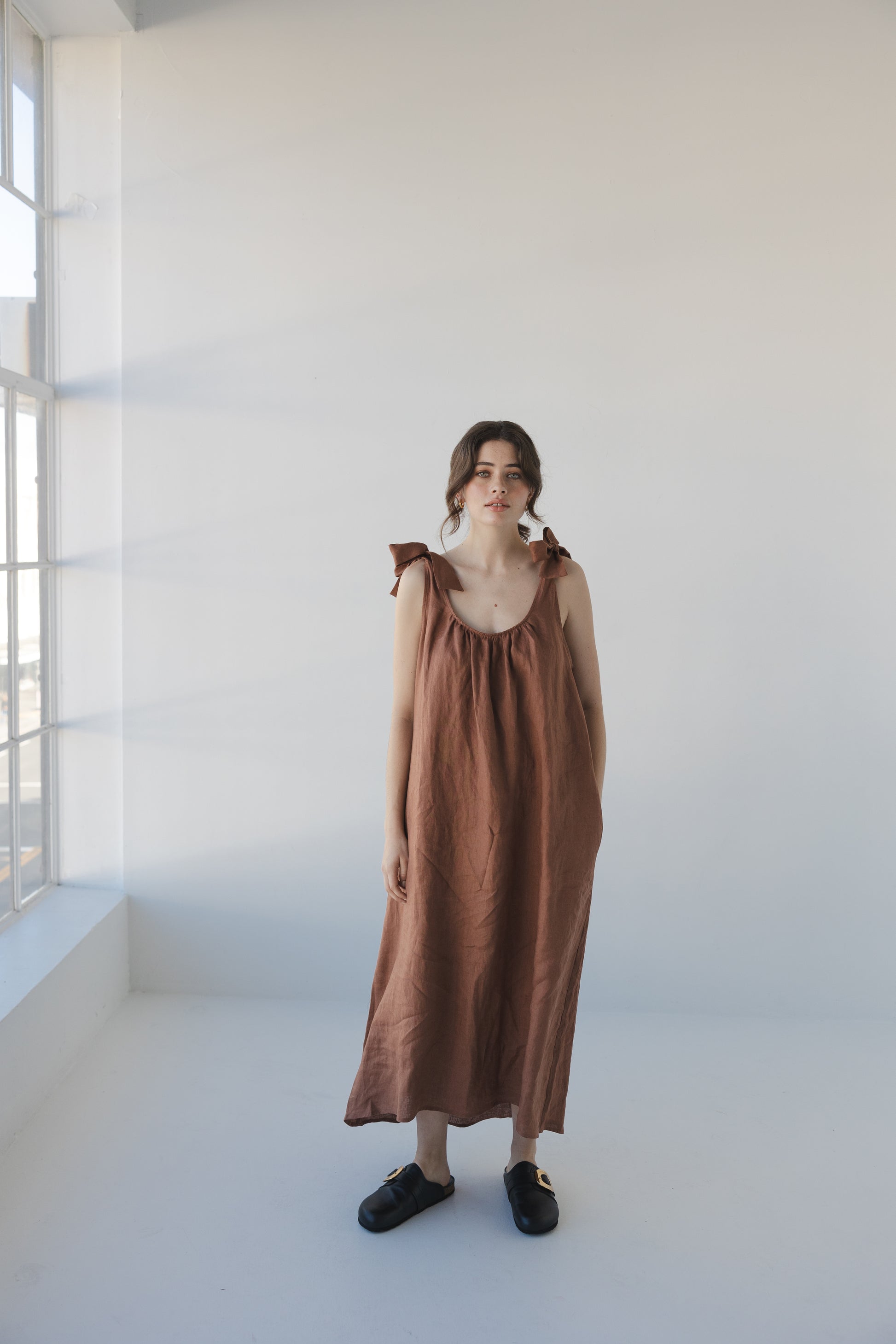 Easy wearing linen dress featuring adjustable tie straps. Pockets & relaxed oversized fit. Works all year round, with sandals or sneakers, add a blazer over or a t-shirt under for a little warmth.