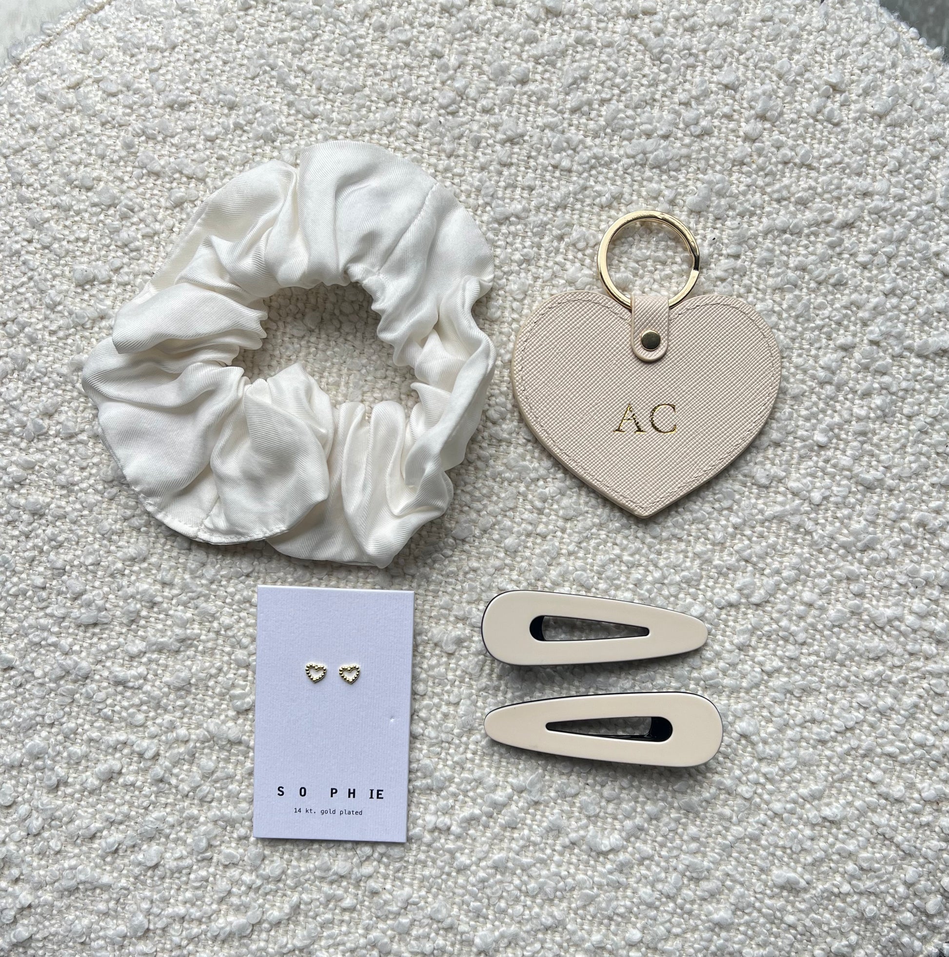 A great gift for the bride. Ivory clips, oversized scrunchie, personalised keyring with her new initials & lovely little studs.