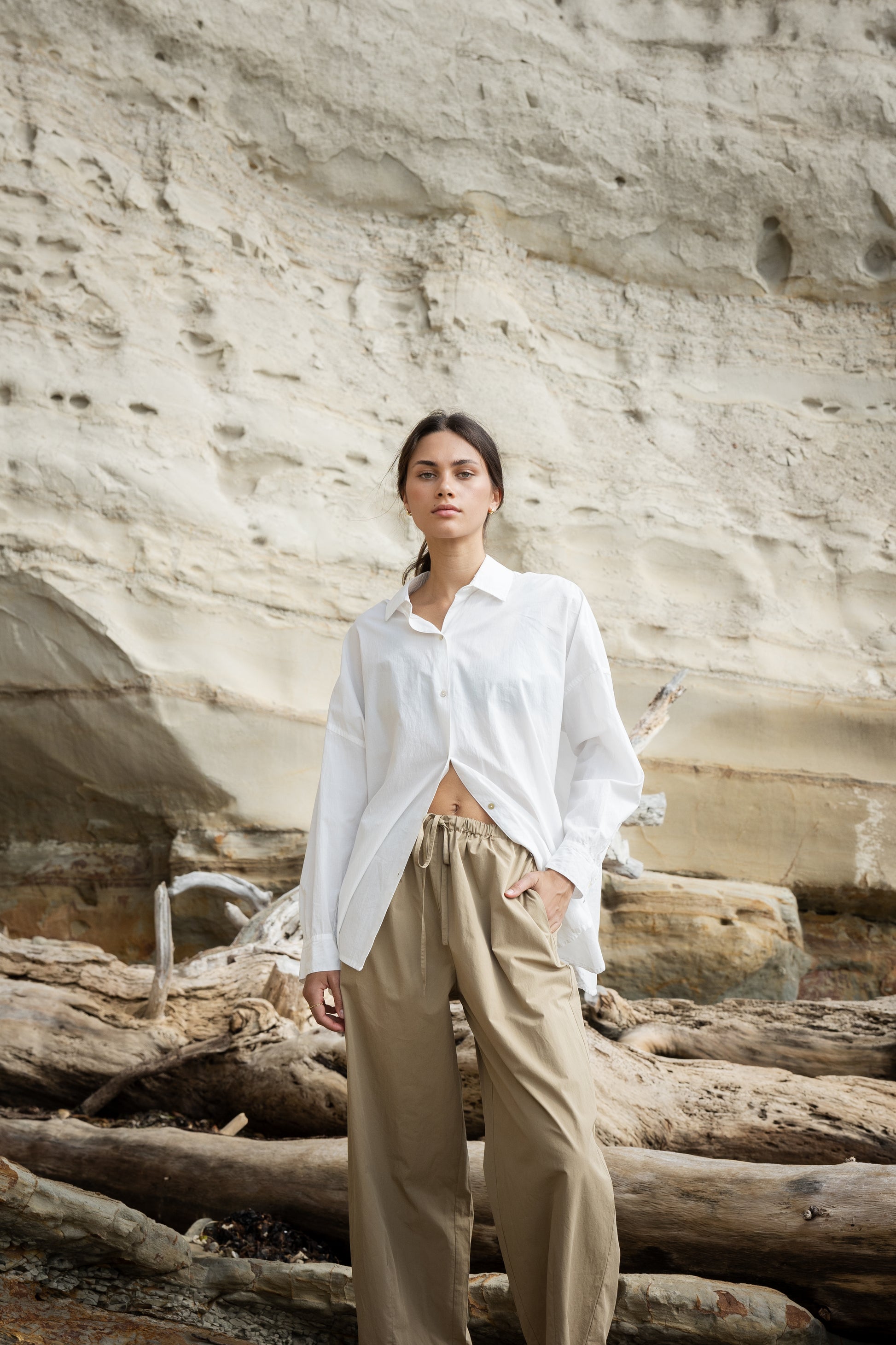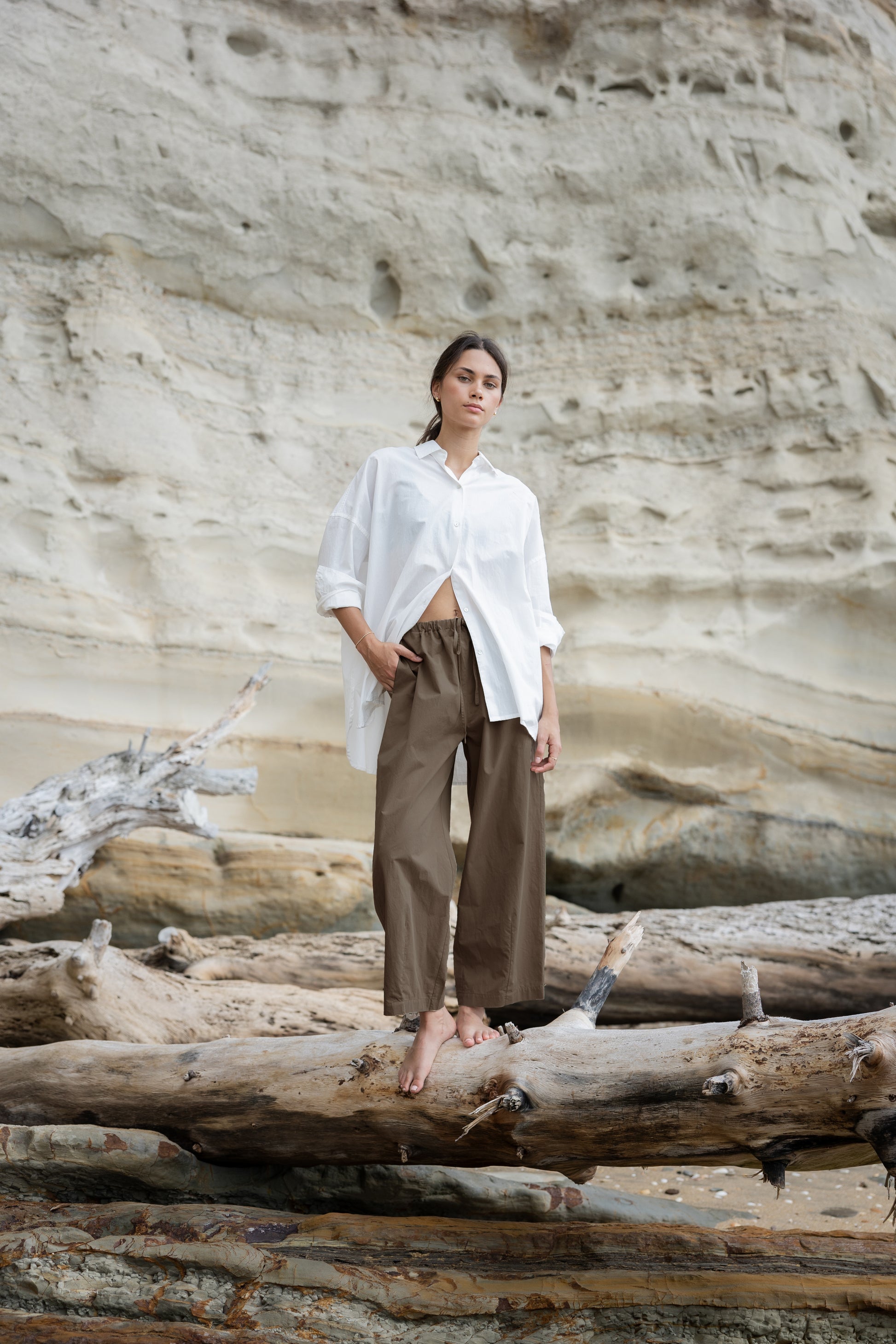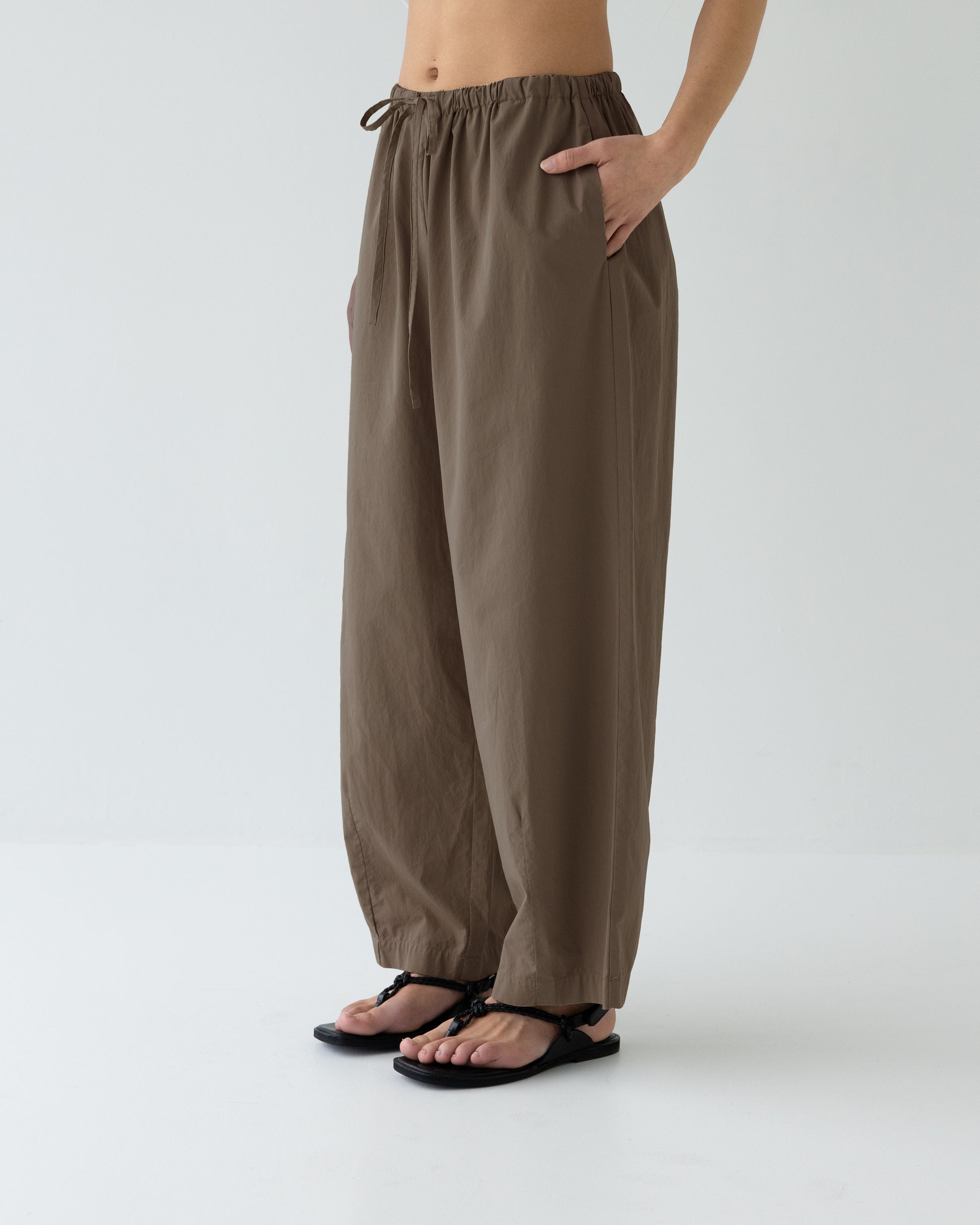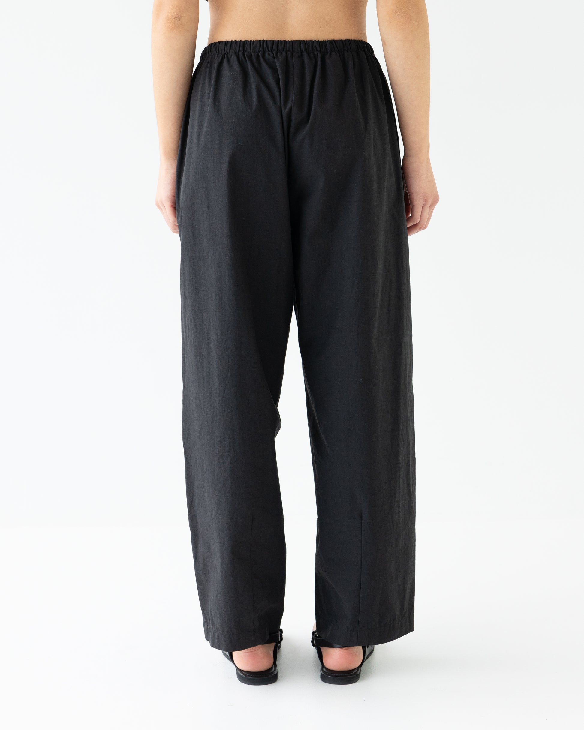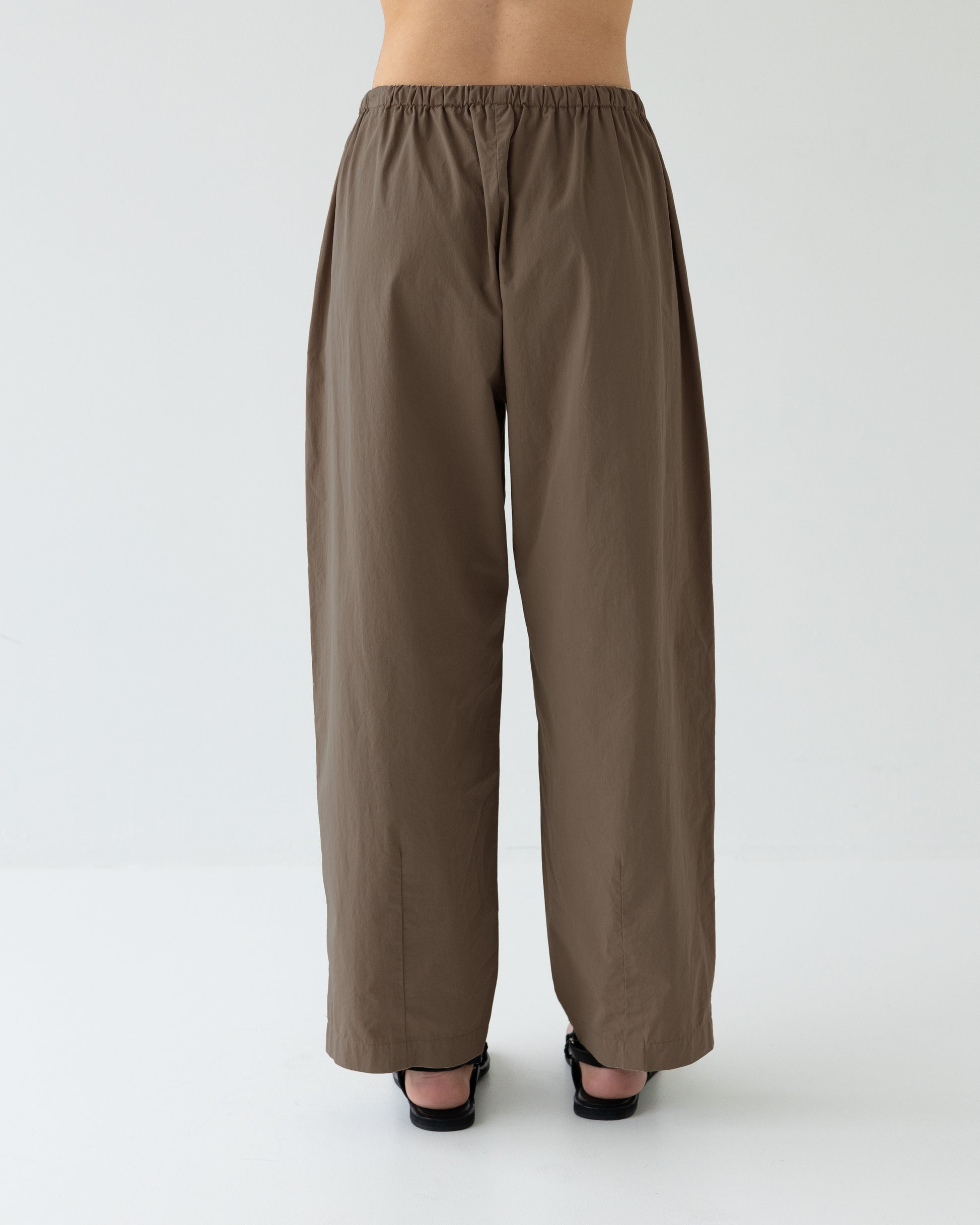 Light weight cotton pants, elasticated waist. Darted hem for a subtle barrel leg. You will live in these.
