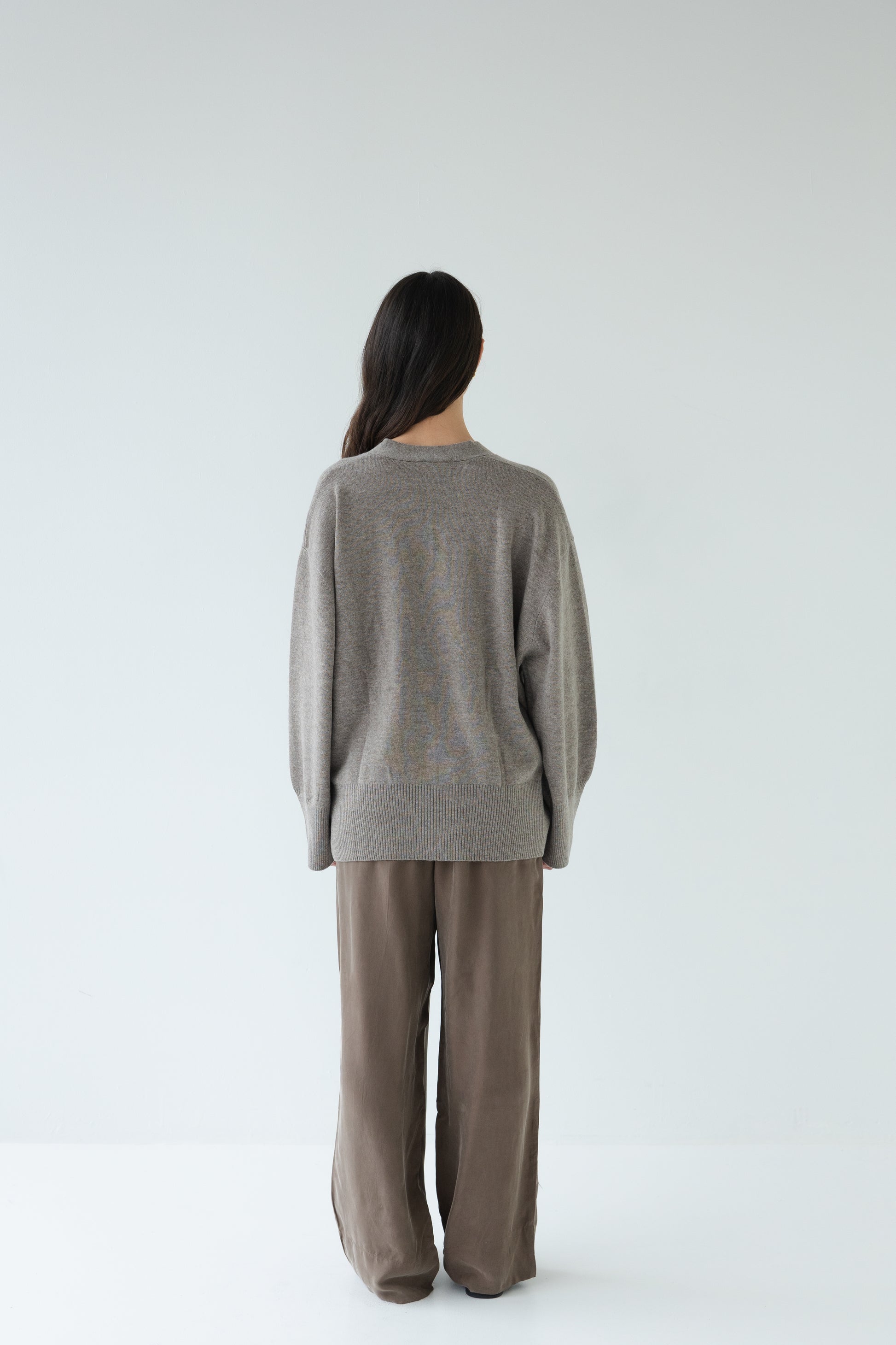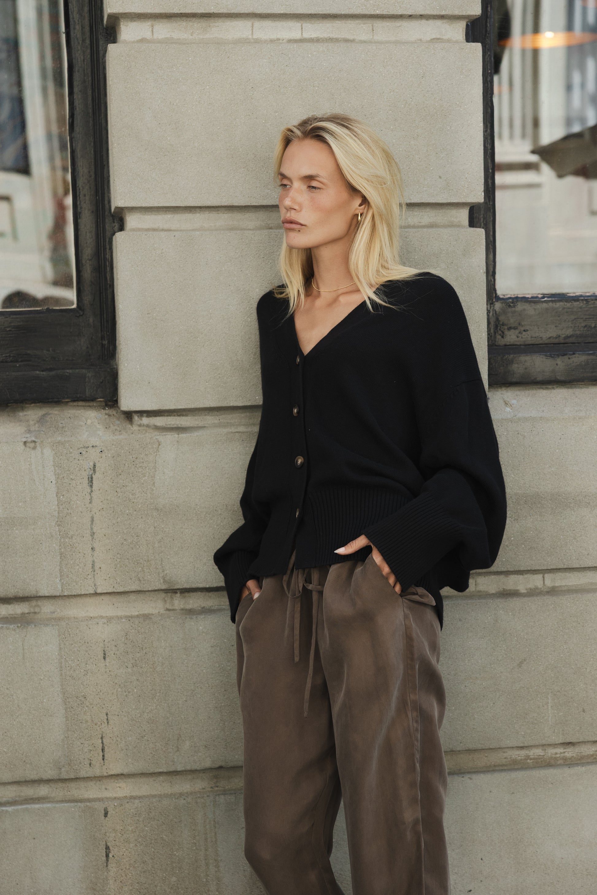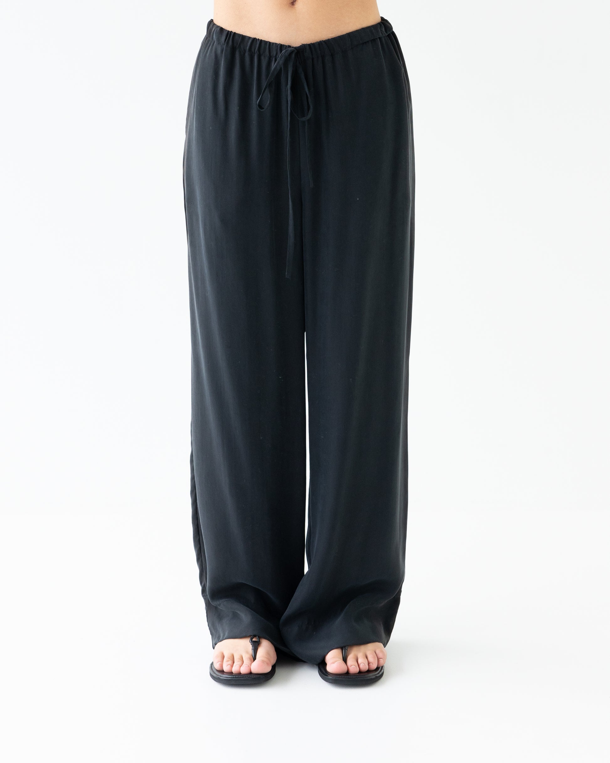 A wide leg trouser with a heavy hem, a relaxed fit with side pockets and a drawstring waistband for comfort.