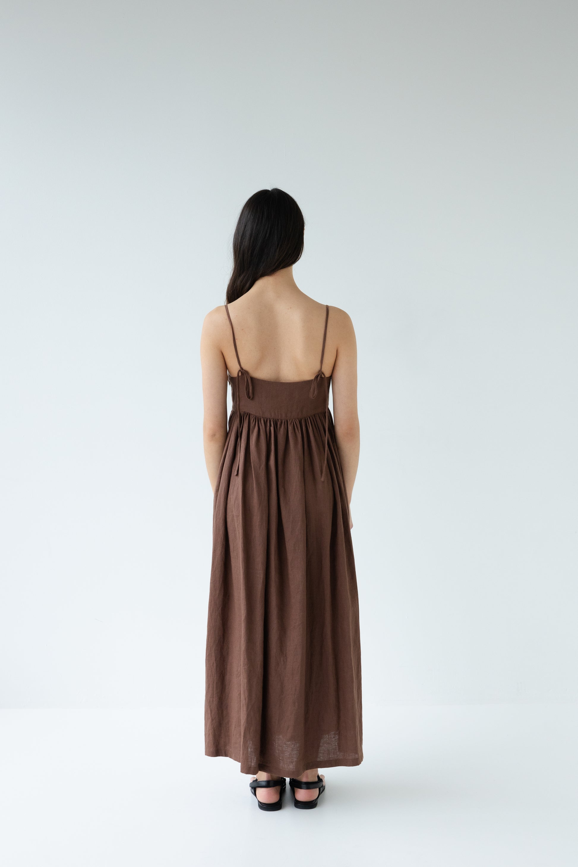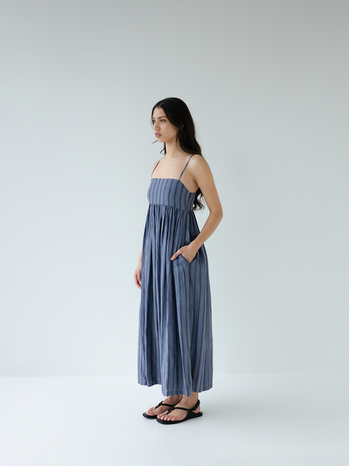Empire line dress with fine straps, adjustable and looped into delicate bows. Gathered under the bust to create a full dress, finishing above the ankle. Side pockets for ease and comfort. A go-to for many occasions.