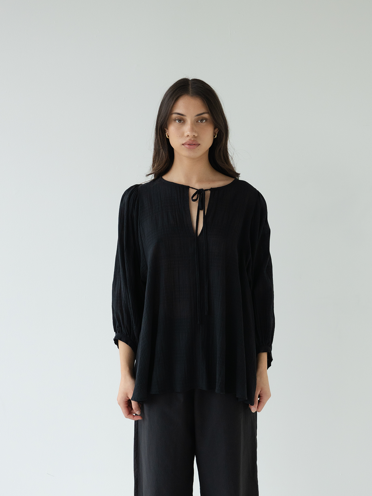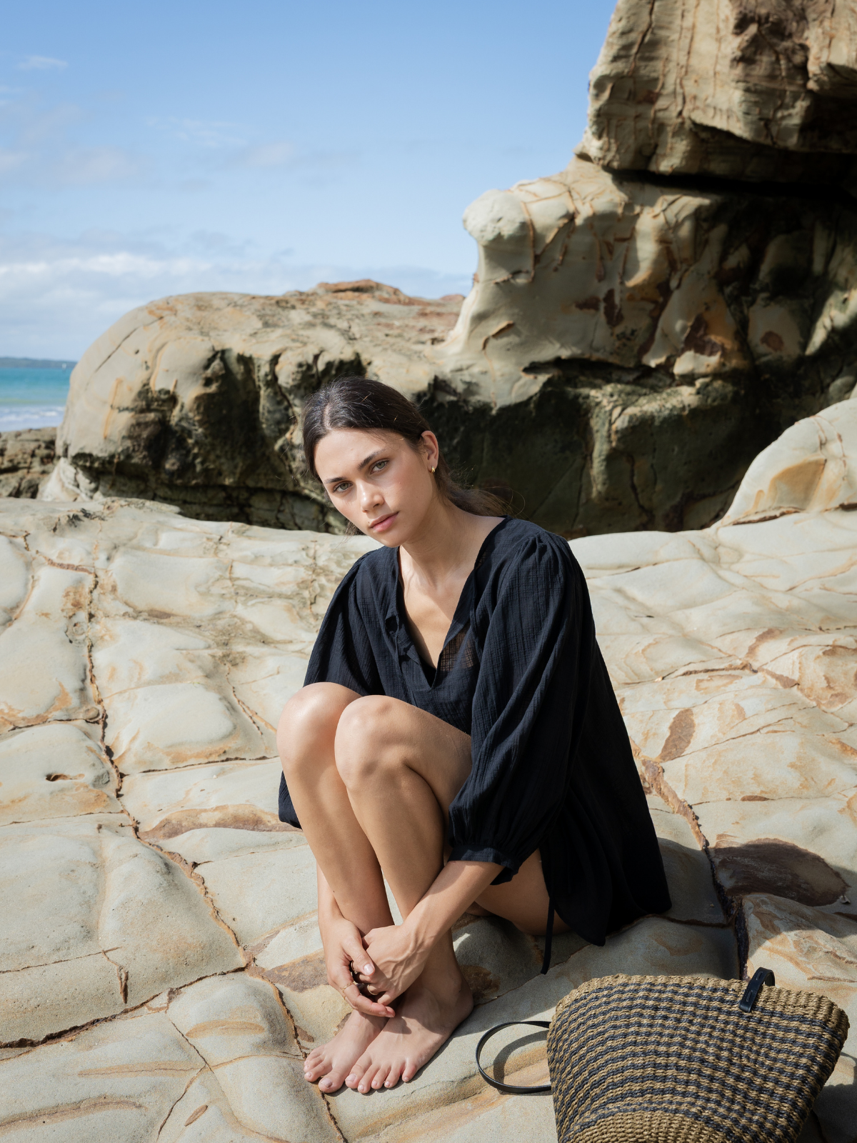 Throw on & go top, beach or every day. Black check or forest cotton. Subtle statement sleeve, cute.