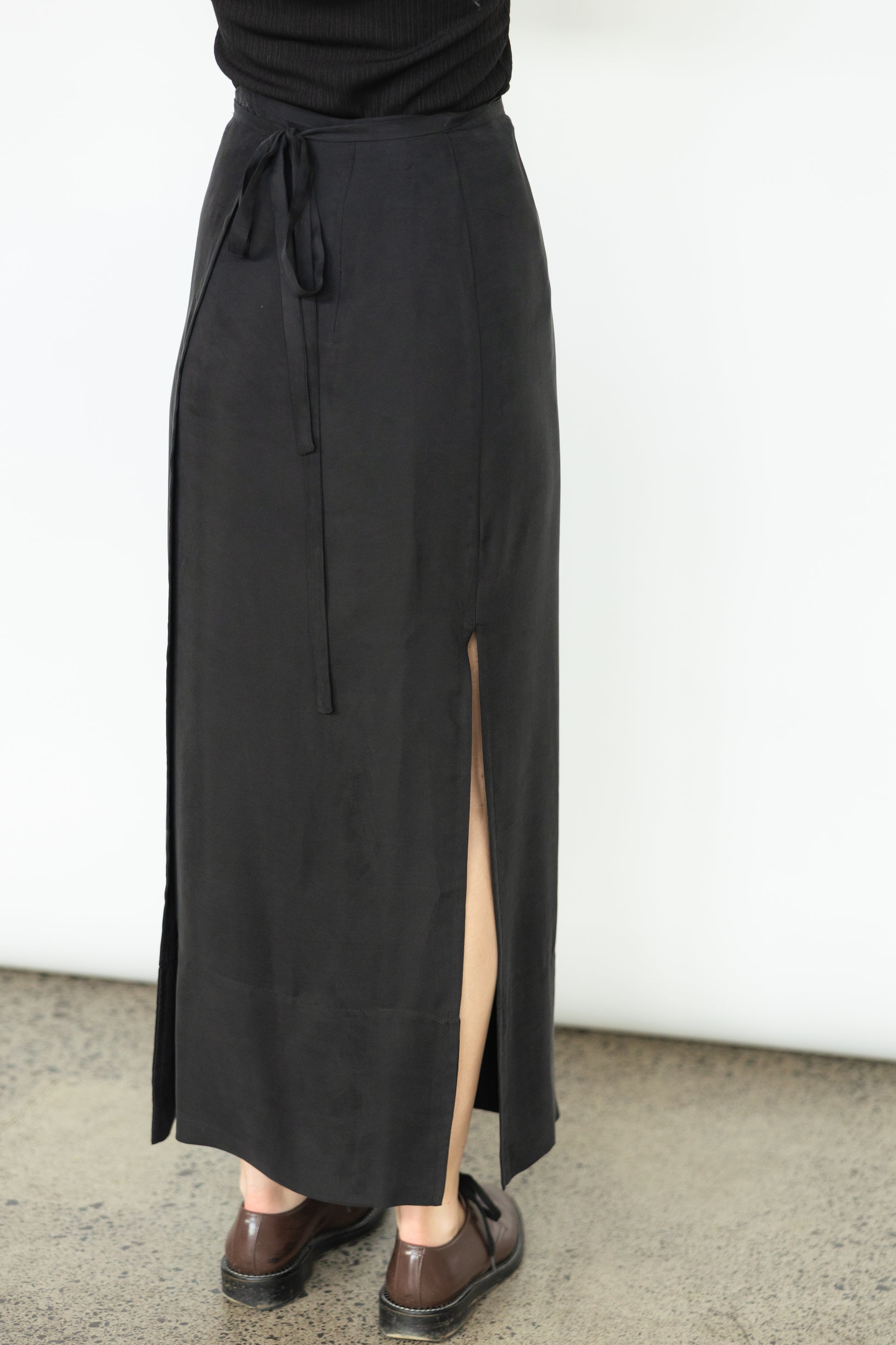 Features a back split, a wide hem to give weight to the skirt, darts at waist to create shaping, small loop for tie.